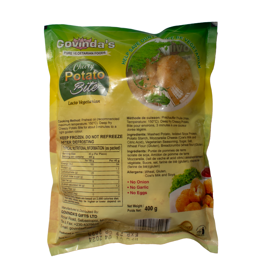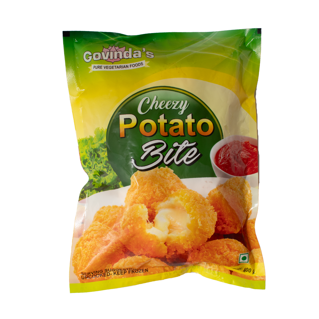 Introducing Govinda’s Gift Cheezy Potato Bite, a delicious and savory snack that combines the creamy goodness of mashed potatoes with the rich taste of paneer. This 400g pack is crafted with high-quality mashed potatoes and potato starch, creating a soft and fluffy interior. The addition of paneer, made from cow's milk and citric acid, adds a delightful cheesy flavor that enhances every bite.