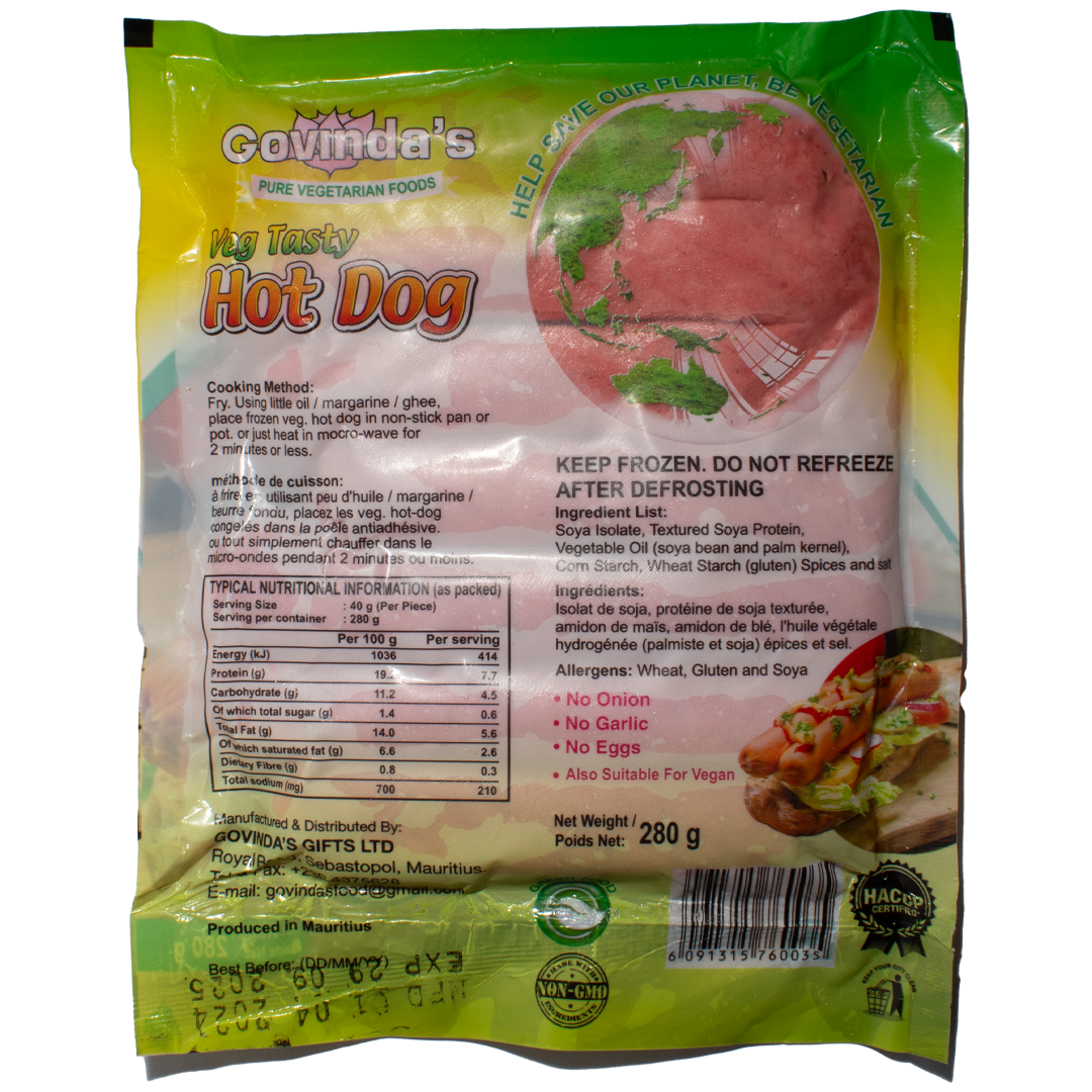 Satisfy your cravings with Govinda’s Gift Veg Hot Dog, a delicious and wholesome plant-based alternative to traditional hot dogs. This 280g pack is expertly crafted using high-quality soya isolate and textured soya protein, providing a rich source of plant-based protein with a satisfying, meaty texture. The vegetable oils from soya bean and palm kernel ensure a juicy and tender bite, while corn starch and wheat starch (gluten) contribute to the perfect firmness.