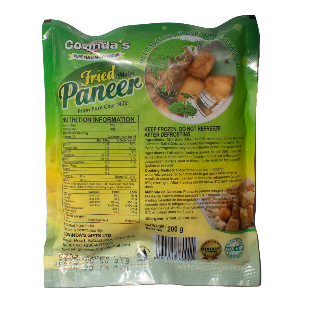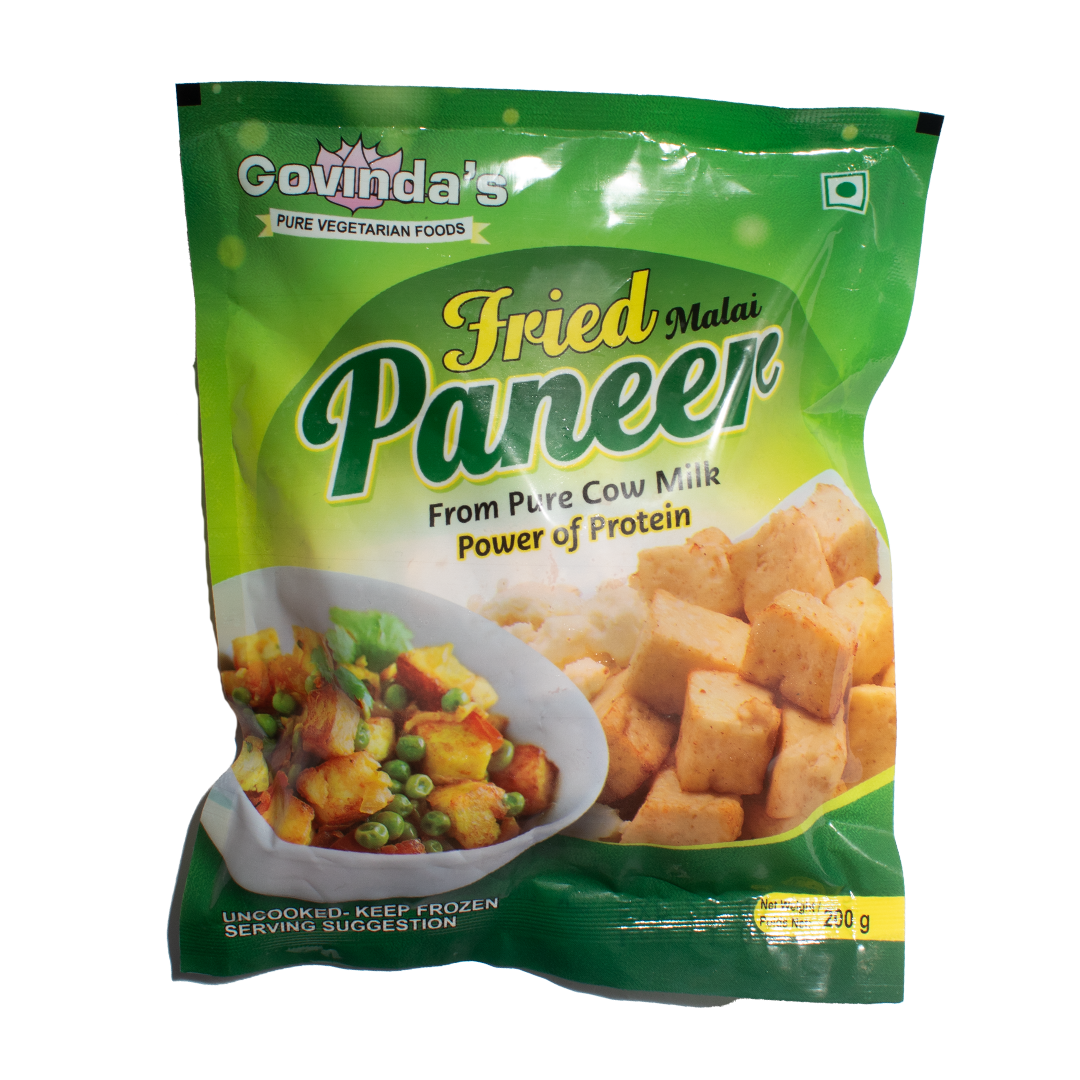Savor the rich and creamy taste of Govinda’s Gift Fried Paneer, a delicious and versatile addition to any meal. This 200g pack features high-quality paneer made from milk solids with a minimum of 20% milk fat, ensuring a rich and indulgent texture. The paneer is coagulated using citric acid, with common salt enhancing the natural flavors.