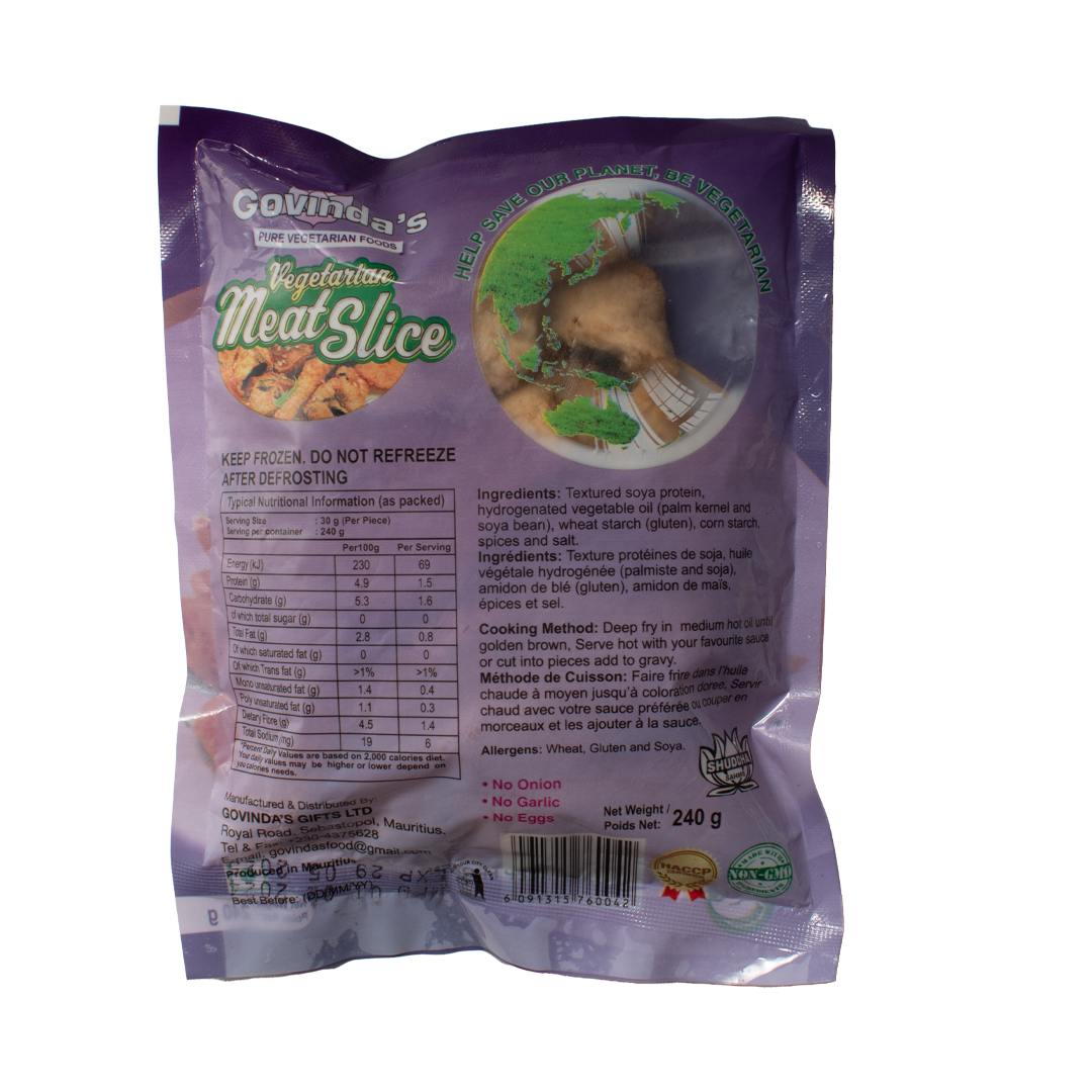 Infused with a carefully balanced blend of spices and salt, Govinda’s Gift Veg. Meat Slice delivers a flavorful and savory experience that will enhance any meal. Whether you're making sandwiches, adding them to salads, or incorporating them into your favorite recipes, these plant-based meat slices are versatile and easy to prepare.