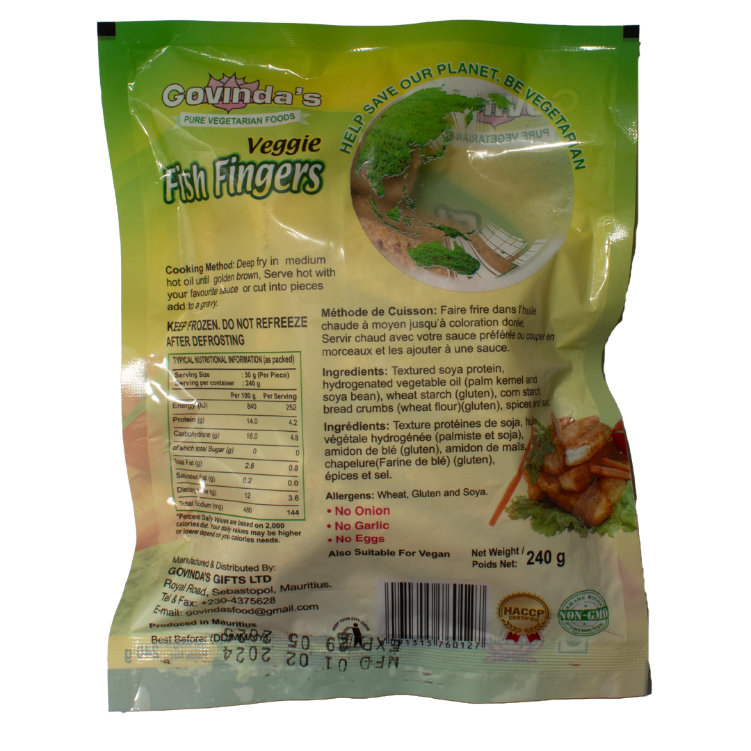 Each veggie fish finger is coated with golden bread crumbs made from wheat flour, creating a crispy and satisfying exterior. Infused with a carefully balanced blend of spices and salt, Govinda’s Gift Veggie Fish Fingers deliver a savory and flavorful experience that will enhance any meal.