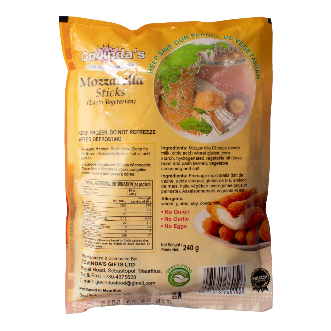 Indulge in the gooey, cheesy goodness of Govinda’s Gift Mozzarella Sticks, a delightful snack perfect for any occasion. This 240g pack is crafted using high-quality mozzarella cheese made from cow's milk and citric acid, providing a rich and creamy taste that melts beautifully. The mozzarella is coated in a crispy breading made from wheat gluten and corn starch, ensuring a satisfying crunch with every bite.