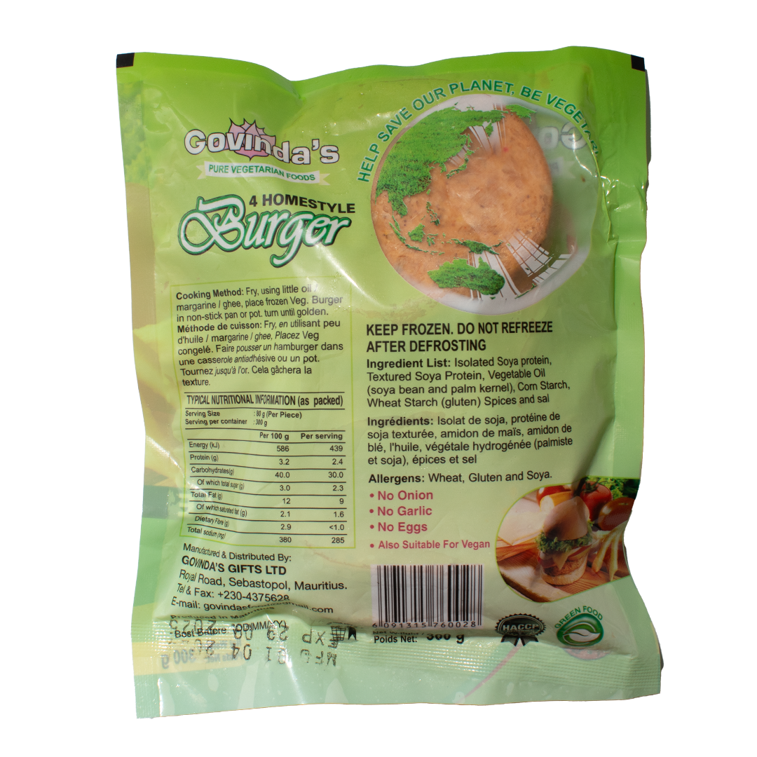 Experience the hearty and satisfying taste of Govinda’s Gift 4 Large Burger Patties. Crafted with premium ingredients, these 300g patties offer a perfect balance of flavor and nutrition. Each patty is made with a blend of isolated and textured soya protein, providing a rich source of plant-based protein. The addition of vegetable oils from soya bean and palm kernel ensures a juicy and tender texture, while corn starch and wheat starch (gluten) contribute to a firm and satisfying bite.