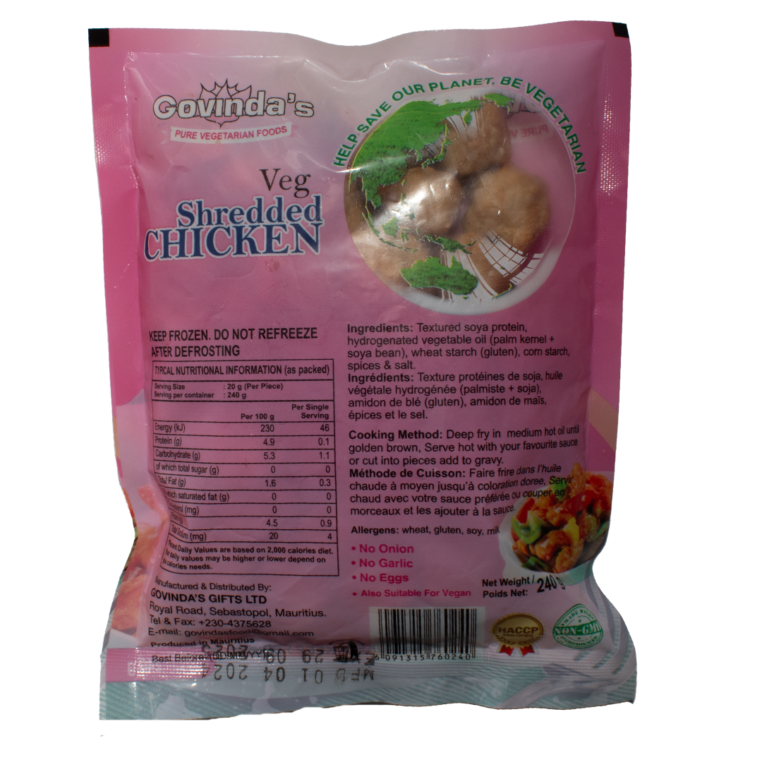Introducing Govinda’s Gift Veg. Shredded Chicken, a versatile and delicious plant-based alternative that perfectly mimics the texture and taste of shredded chicken. Made with high-quality textured soya protein, this 240g pack is rich in plant-based protein, providing a nutritious option for your meals. The addition of hydrogenated vegetable oils from palm kernel and soya bean ensures a juicy and tender bite, while wheat starch and corn starch contribute to the ideal firmness.