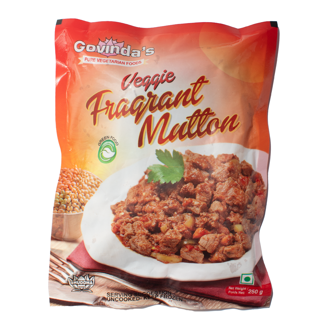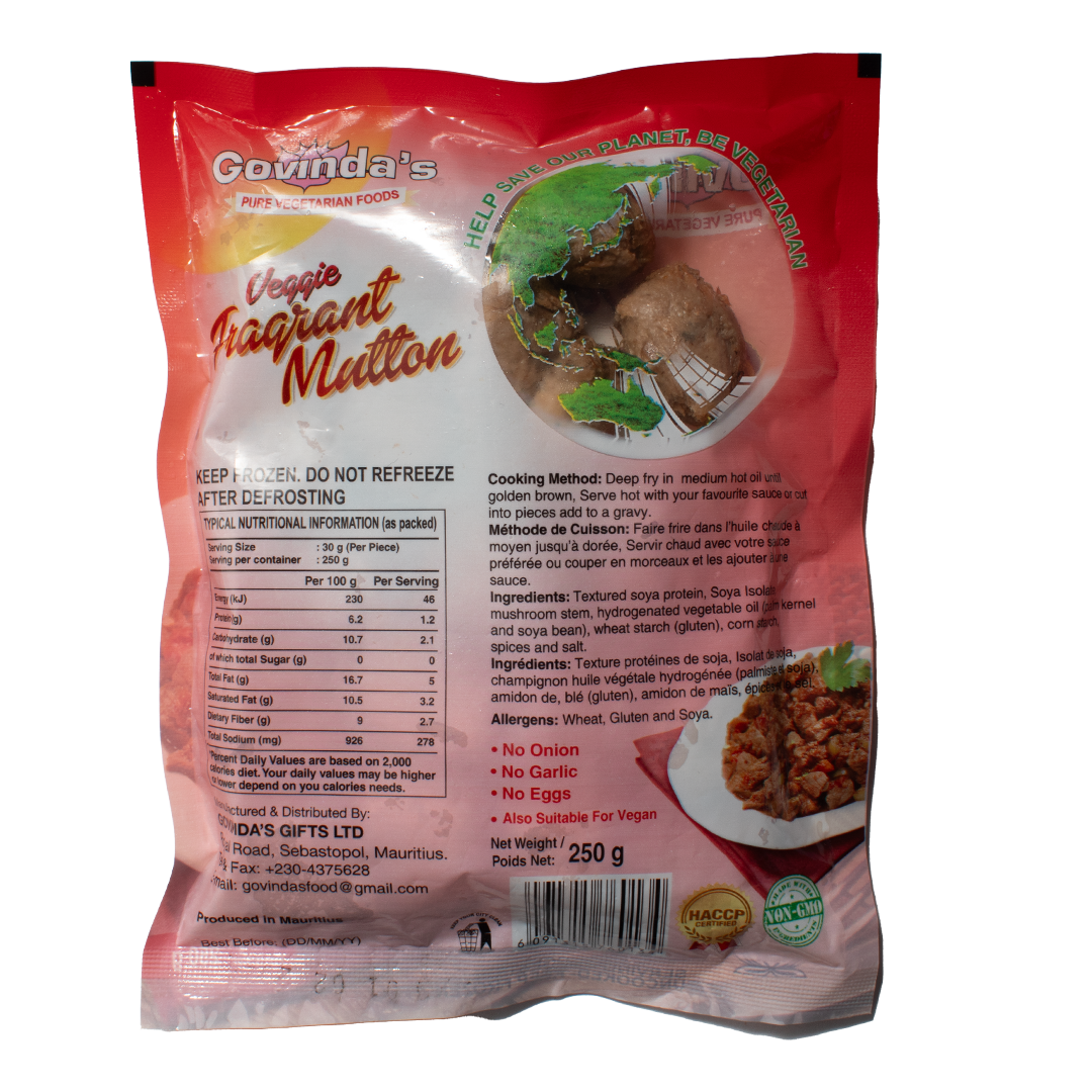 Introducing Govinda’s Gift Veg. Fragrant Mutton, a premium plant-based alternative that captures the essence of traditional mutton with a delightful and aromatic twist. This 240g pack is crafted using high-quality textured soya protein and soya isolate, providing a rich source of plant-based protein with a texture that closely mimics the tender bite of real mutton. The inclusion of mushroom stems enhances the umami flavor, while hydrogenated vegetable oils from palm kernel and soya bean ensure a juicy and succulent consistency. Wheat starch and corn starch contribute to the perfect firmness, making these vegan mutton pieces versatile and easy to cook. Infused with a carefully balanced blend of spices and salt, Govinda’s Gift Veg. Fragrant Mutton delivers a savory and fragrant taste that will elevate any dish. Whether you’re preparing curries, stews, or stir-fries, this product offers a rich and flavorful experience that brings the taste of mutton to your vegetarian cuisine.