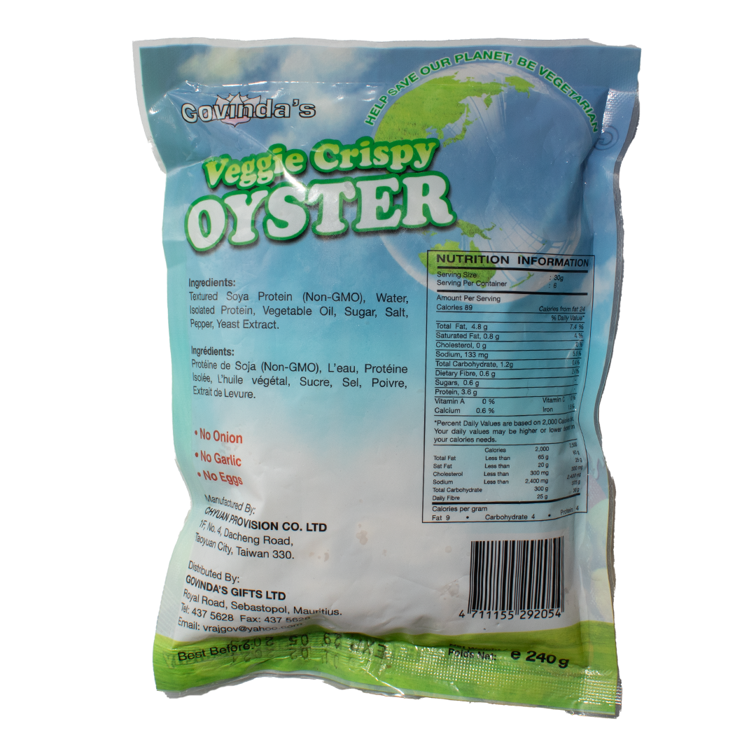 Introducing Govinda’s Gift Veggie Crispy Oyster, a delectable plant-based alternative to traditional oysters. This 240g pack is crafted using high-quality non-GMO textured soya protein and isolated protein, providing a rich source of plant-based protein with a satisfying and meaty texture. The inclusion of vegetable oil ensures a juicy and tender bite, while the balanced blend of sugar, salt, pepper, and yeast extract delivers a savory and flavorful experience.