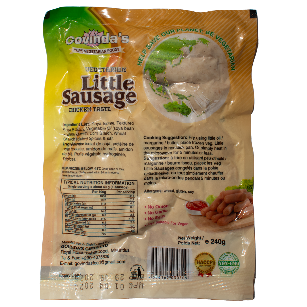 Introducing Govinda’s Gift Little Sausages, a delightful plant-based alternative perfect for any meal. This 240g pack is crafted using high-quality soya isolate and textured soya protein, providing a rich source of plant-based protein with a satisfying and meaty texture. The vegetable oils from soya bean and palm kernel ensure a juicy and tender bite, while corn starch and wheat starch (gluten) add the perfect firmness.
